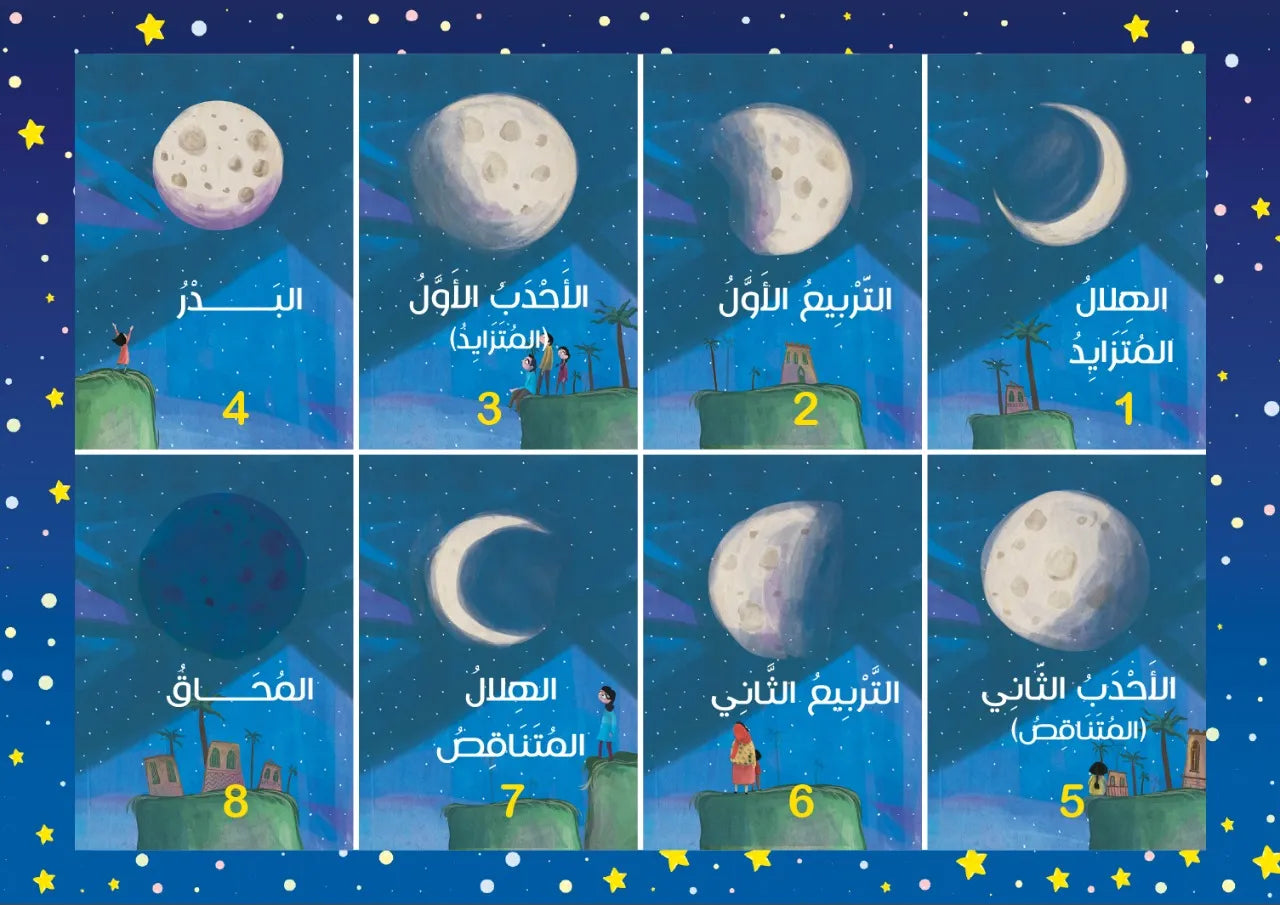 بالإضافة إن خلف كل كارت تعريف ومعنى لكل مرحله من مراحل تطور القمر