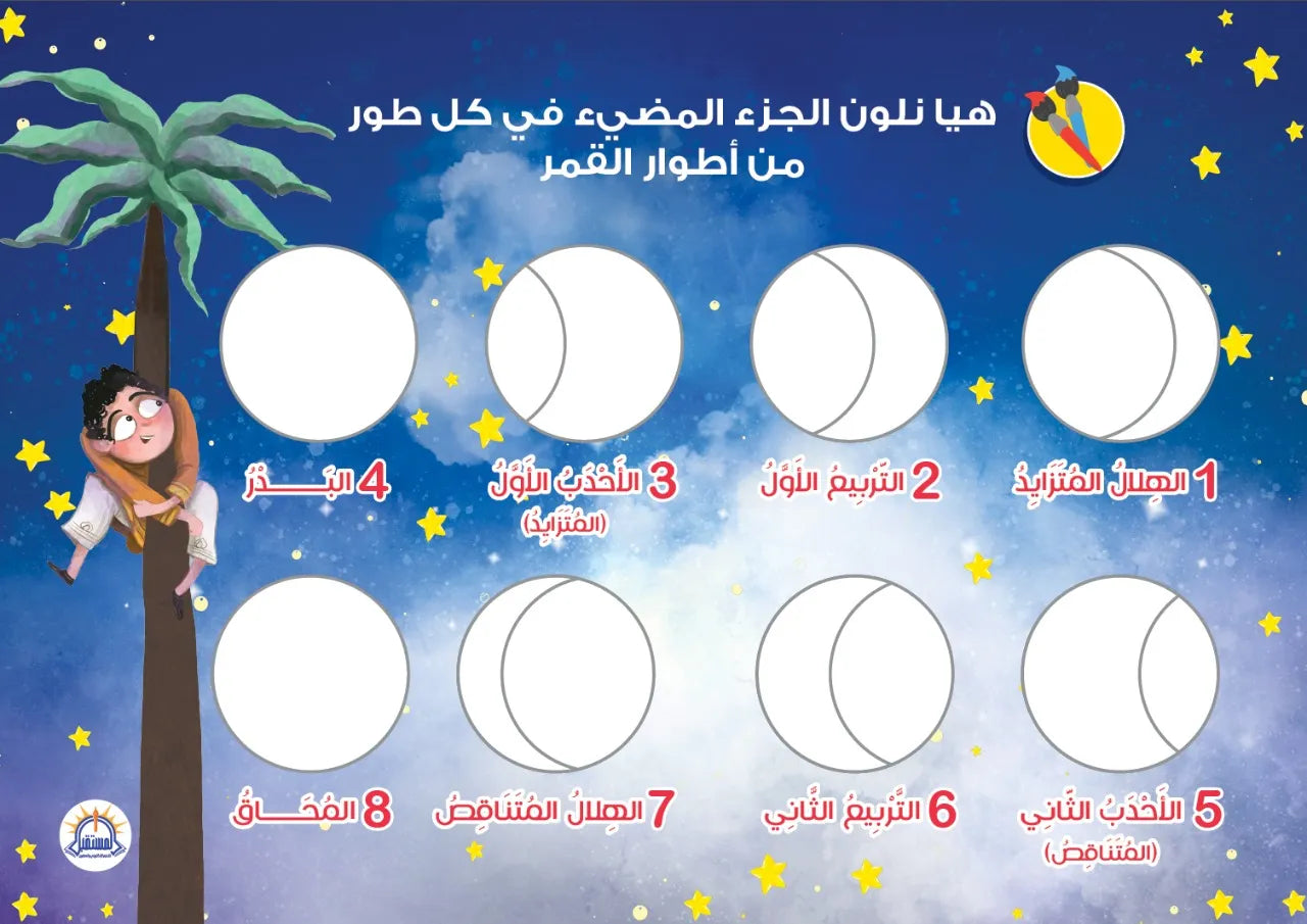 4- لوحة التلوين : وهي نشاط تفاعلي للطفل وفيها يلون الطفل مراحل تطور القمر بالكامل لمراجعة وتثبيت ما تعلمه وإضافة جو من المتعة والتشويق لعملية التعليم