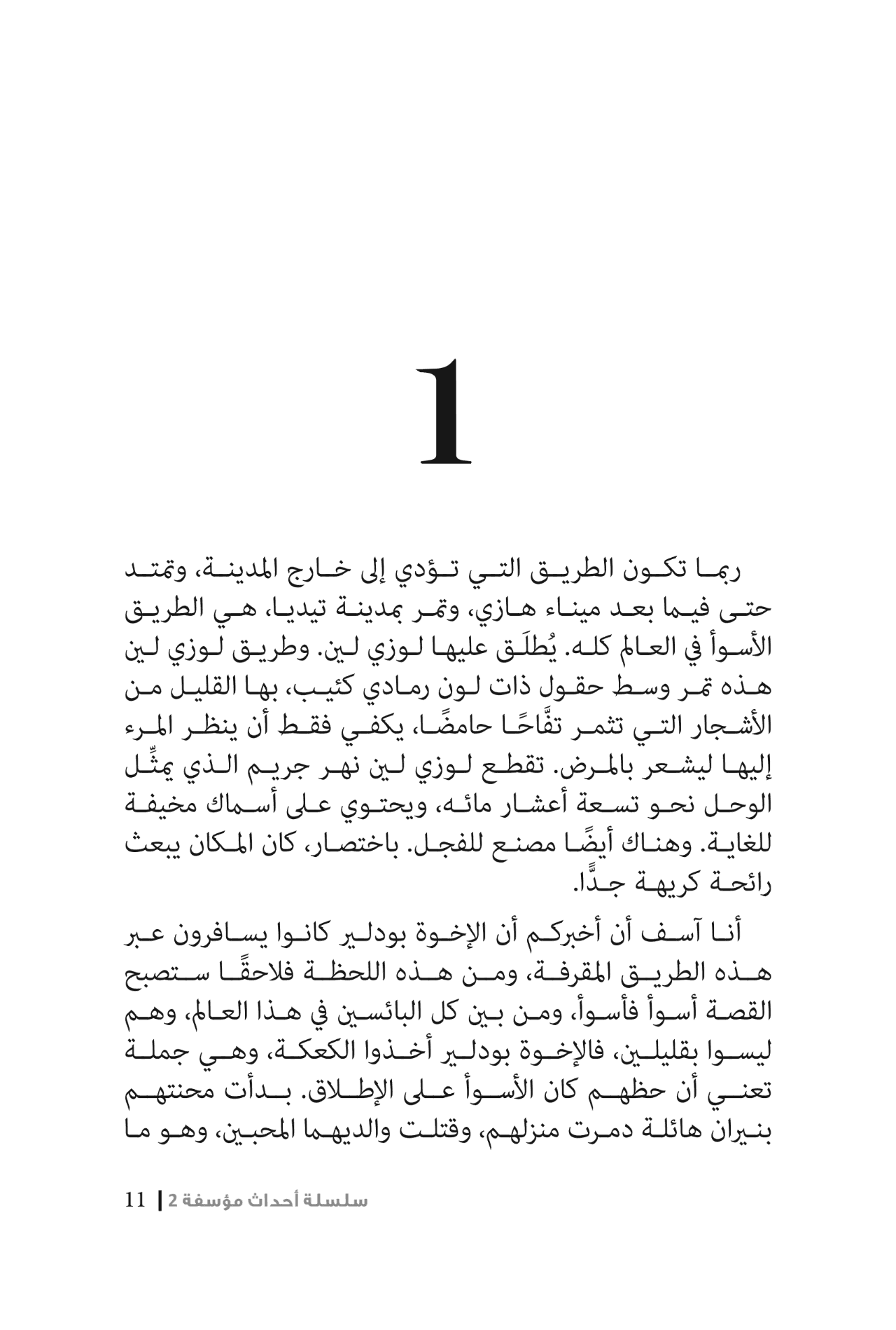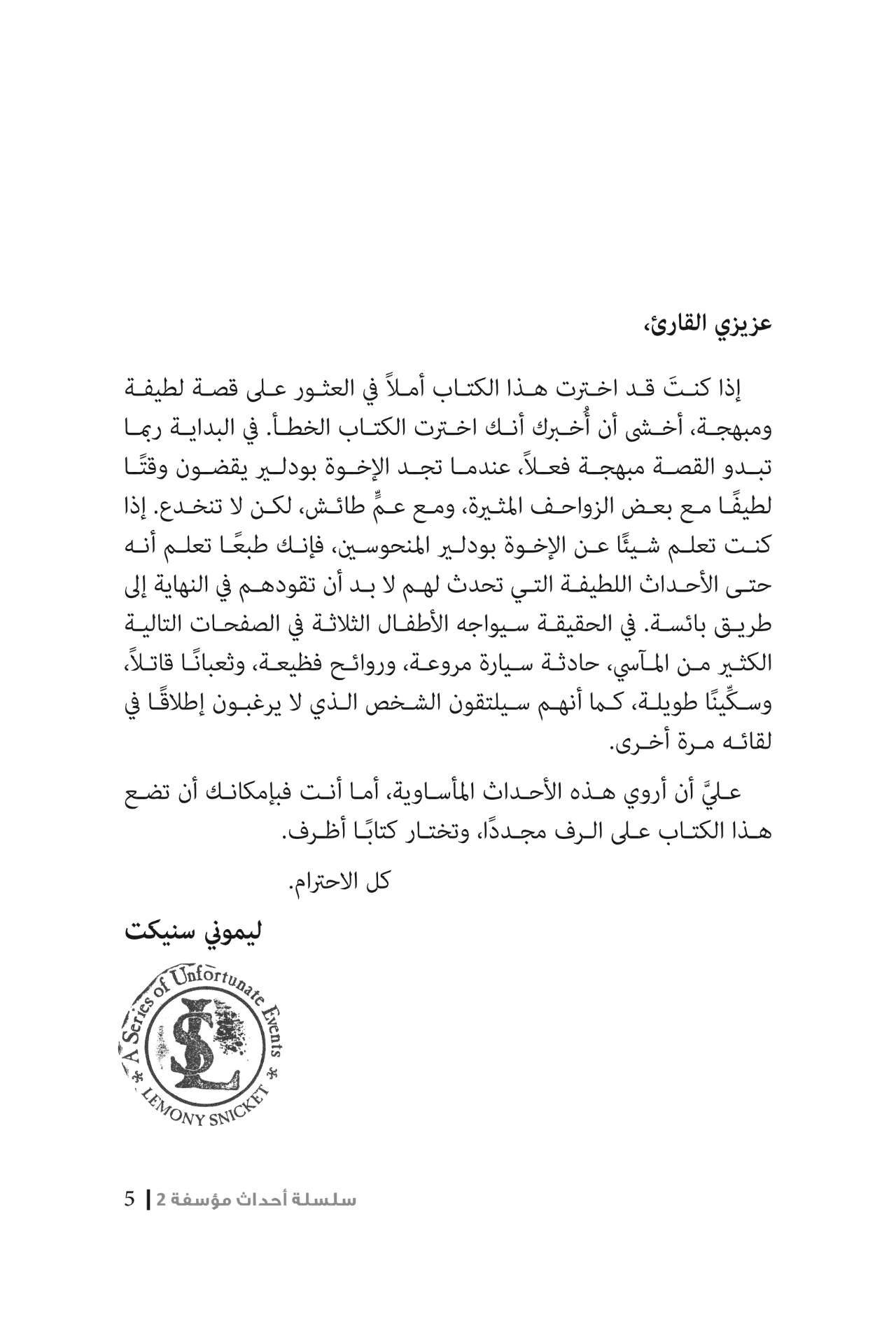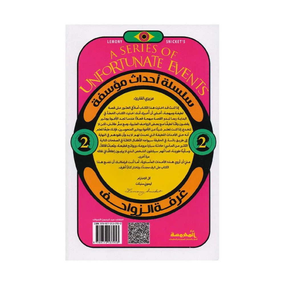 سلسلة أحداث مؤسفة 2 " غرفة الزواحف" بقلم ليمونى سنيكت ... عزيزي القارئ، إذا كنت قد اخترت هذا الكتاب أملا في العثور على قصة لطيفة ومبهجة، أخشى أن أخبرك أنك اخترت الكتاب الخطأ. في البداية ربما تبدو القصة مبهجة فعلا عندما تجد الأخوة بودلير يقضون وقتا لطيفا مع بعض الزواحف المثيرة، ومع عم طائش ولكن لا تنخدع, أذا كنت تعلم شيئا عن الأخوة بودلير المنحوسين فإنك طبعا تعلم أنه حتى الأحداث اللطيفة التي تحدث لهم لابد أن تقودهم في النهاية إلى طريق بائسة. في الحقيقة سيواجه الأطفال الثلاثة في الصفحات التالية الكثير من المآسي حادثة سيارة مروعة، وروائح فظيعة وثعبانا قاتلا وسكينا طويلة كما أنهم سلتقون الشخص الذي لا يرغبون إطلاقا في لقائه مرة أخرى. على أن أروى الأحداث المأساوية، أما أنت فبإمكانك أن تضع هذا الكتاب على الرف مجددا، وتختار كتابا أظرف. كل الإحترام ليموني سنيكت