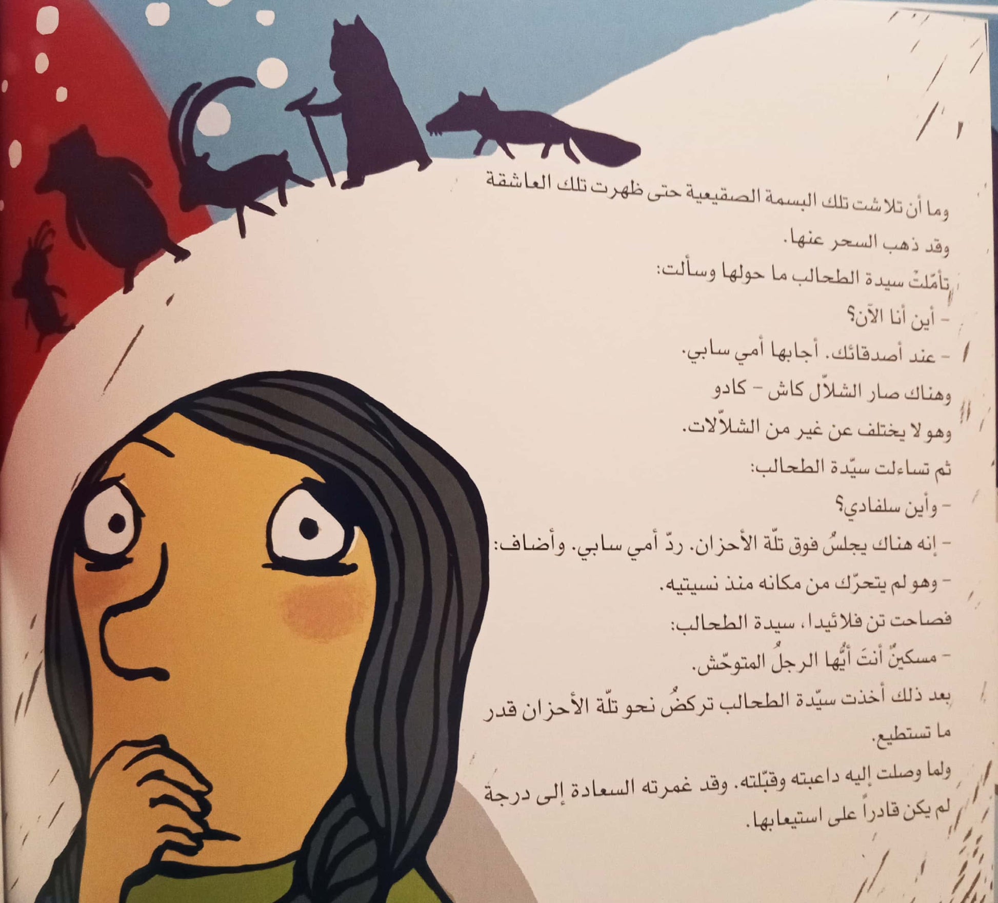 كان الثلج يهطل ولم يتوقف عن الهطول. وكان على أمي سابي إذا أراد أن يتوقف هطول الثلج أن ينقل "حجر الطقس" من "مكان الثلج" إلى مكان مشمس. لكنه لم يستطع أن ينجز هذه المهمة وحده. وكان الرجل القوي سلفادي جالساً على تلة الأحزان مملوءاً بالأسى. شعر أمي سابي أنه يستطيع أن يؤدي هذه المهمة على نحو آخر. ولكن كيف؟ نادى أصدقاءه، حيوان الشامواة والجدي والنسر الملتحي والثعلب والدب... وكلهم أدى واجبه