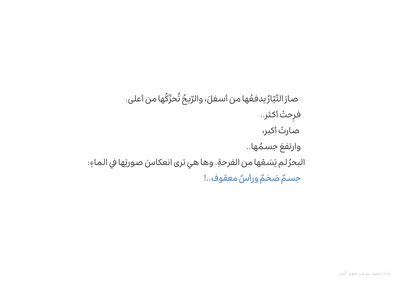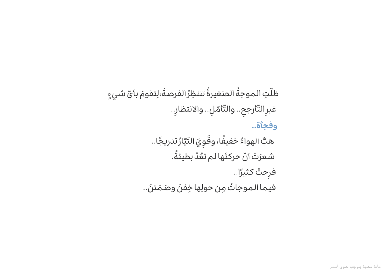 وُلِدتْ موجةٌ صغيرةٌ وَسَطَ البحرِ بين موجاتٍ كثيراتٍ، ووجدتْ نفسها فجأةً تتأرجحُ يَمنةً ويَسرةً، وتسيرُ على مَهلٍ. في البداية أحبّتْ «أرجوحتَها» تلك، لكنّها بعد فترةٍ وجيزةٍ مَلَّتْ، كبر طُموحُها وصارَ حلمُها أن ترى البحرَ ولو لمرّةٍ واحدةٍ