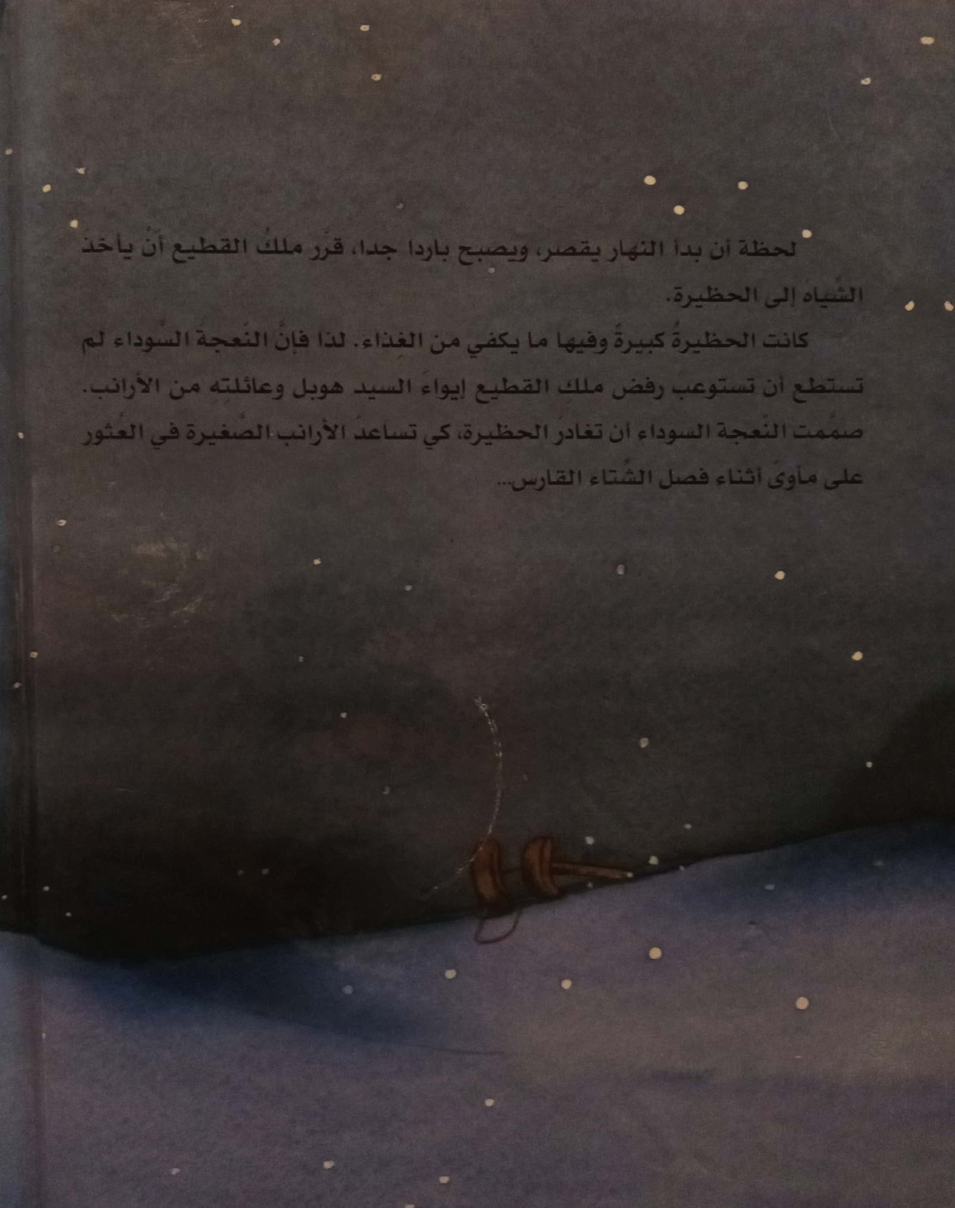 لحظة أن يبدأ النهار يقصر ويصبح بارداً جداً، قرّر ملك القطيع أن يأخذ الشياه إلى الحظيرة. كانت الحظيرة كبيرة وفيها ما يكفي من الغذاء، لذا فإن النعجة السوداء لم تستطع أن تستوعب رفض ملك القطيع إيواء السيد هوبل وعائلته من الأرانب. صمّمت النعجة السوداء أن تغادر الحظيرة كي تساعد الأرانب الصغيرة في العثور على مأوى أثناء فصل الشتاء القارس.