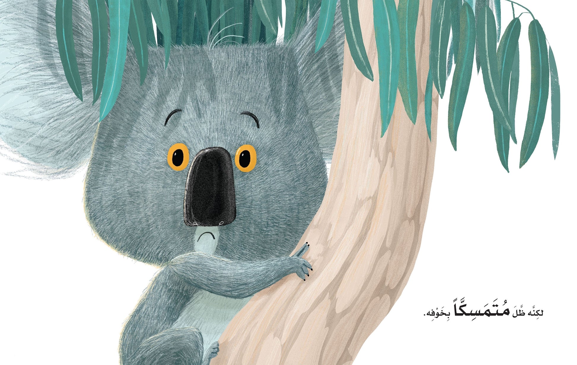 في غابة خضراء، يعيش حيوان الكوالا معلقا على غصن شجرة، يراقب الحيوانات تلعب و تمرح، فيتحسر ويتمنى ان يتغلب على خوفه ليلعب معهم